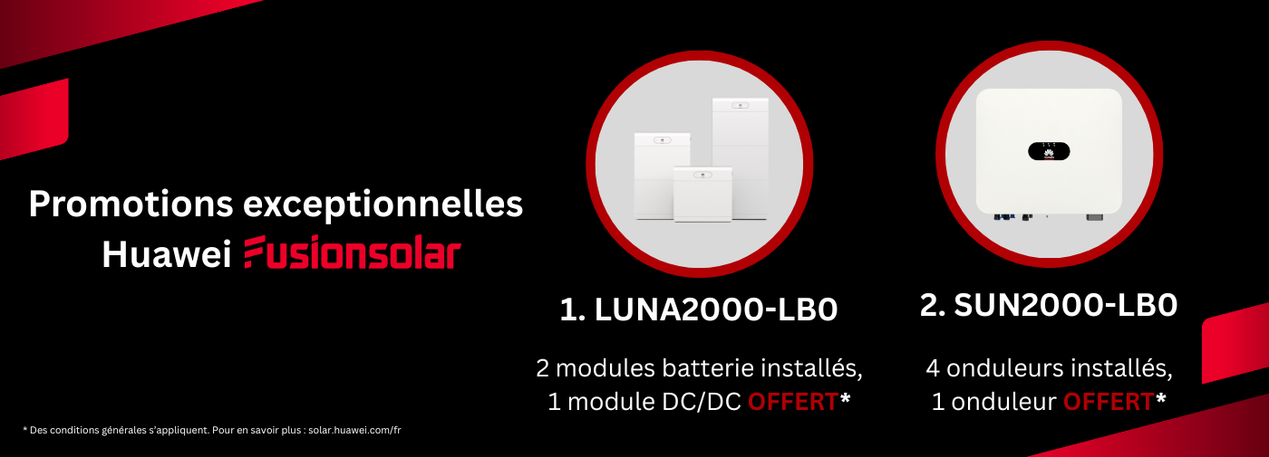 Programme Huawei Smart PV Community: - 4 onduleurs SUN2000-LB0 installés = 1 offert - 2 modules LUNA2000 installés = 1 module DC-DC offert